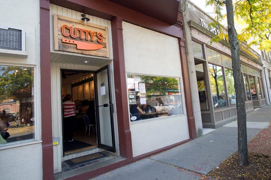 Cutty's could be in Real Simple magazine with blond wood floors, table tops to match, and one of the white walls painted half chalkboard green for use as the menu. The kitchen is open and obvious; when food arrives, it does so on simple white dishes.